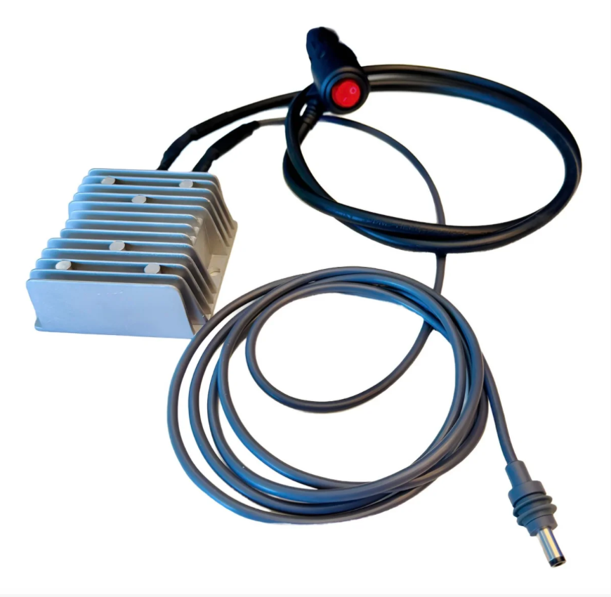 Este cabo de alimentação permite entrada de 10V-36V e converte para 57V DC, perfeito para uso em trânsito, viagens ou como fonte de energia reserva.